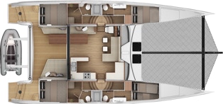 You can choose a Four Cabin Model as well. An option is to have the pipe berth in one or both of the forward cabins. This can fold down or up at an angle when not in use. Use it as a spare crew berth or to put several duffle bags. Inquire about the soft cabinet storage containers that will fit on the pipe berths. Note that the rendering above is actually an HH 50. On the OC 50 the daggerboard trunks could be a shelf system or open space.