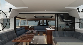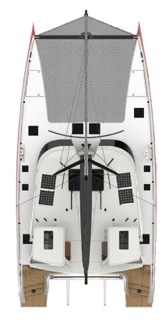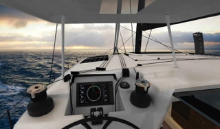 From the protected helms you see the bows and transoms from either station. The wheels are positioned so docking is straight forward. Deck room is unobstructed. Lines are all lead aft. Daggerboards and travelled can be push button line drivers.