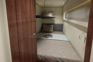 The pipe berth you see here is optional. Aside from that one extra crew, it can serve as a duffle bag shelf. This forward cabin has complete storage lockers and drawers including a voluminous side locker.
