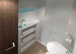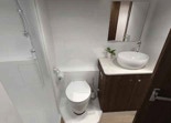 Pictured here is the forward head in the Owner’s Cabin. Full stand-up shower, shelves, lockers, a mirror you can see in while standing up straight.