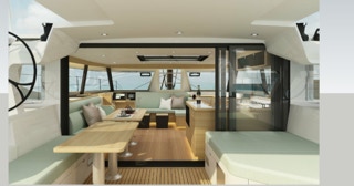 The daggerboard trunks are outboard and un-obtrusive. They’re actually nice to look at in a sculptural sort of way.