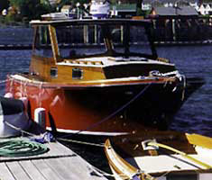 Manufactured by Padebco Custom Boats, Round Pound, Maine from the early 70s to the present. Bruce Cunningham's reputation as a custom boat finisher and builder is highly regarded in the boating community. Although the model shown does not exactly fit the category of the traditional semi-displacement Downeast hull, it does represent a nice combination of a traditional style with the latest technology of jet boat power. |