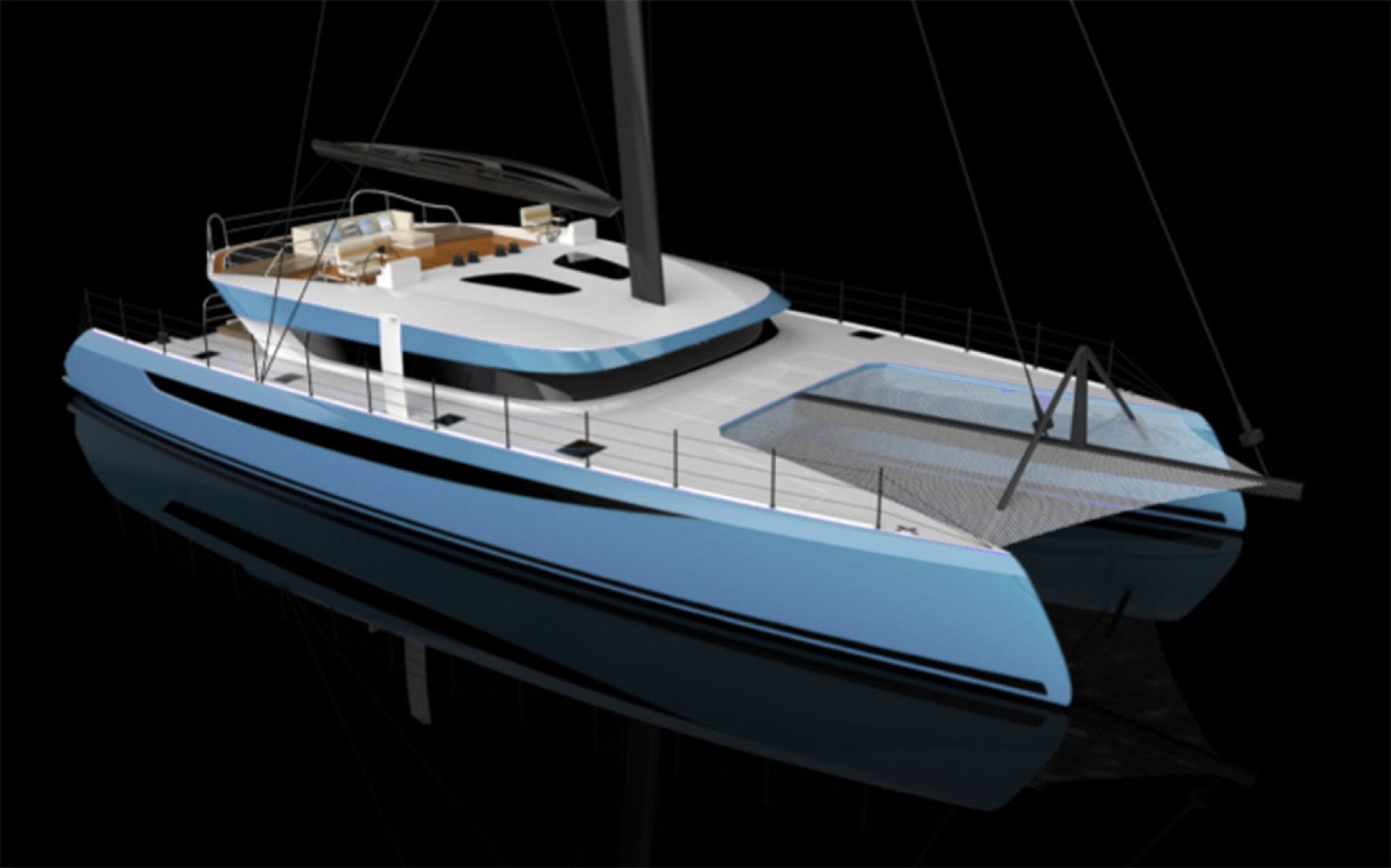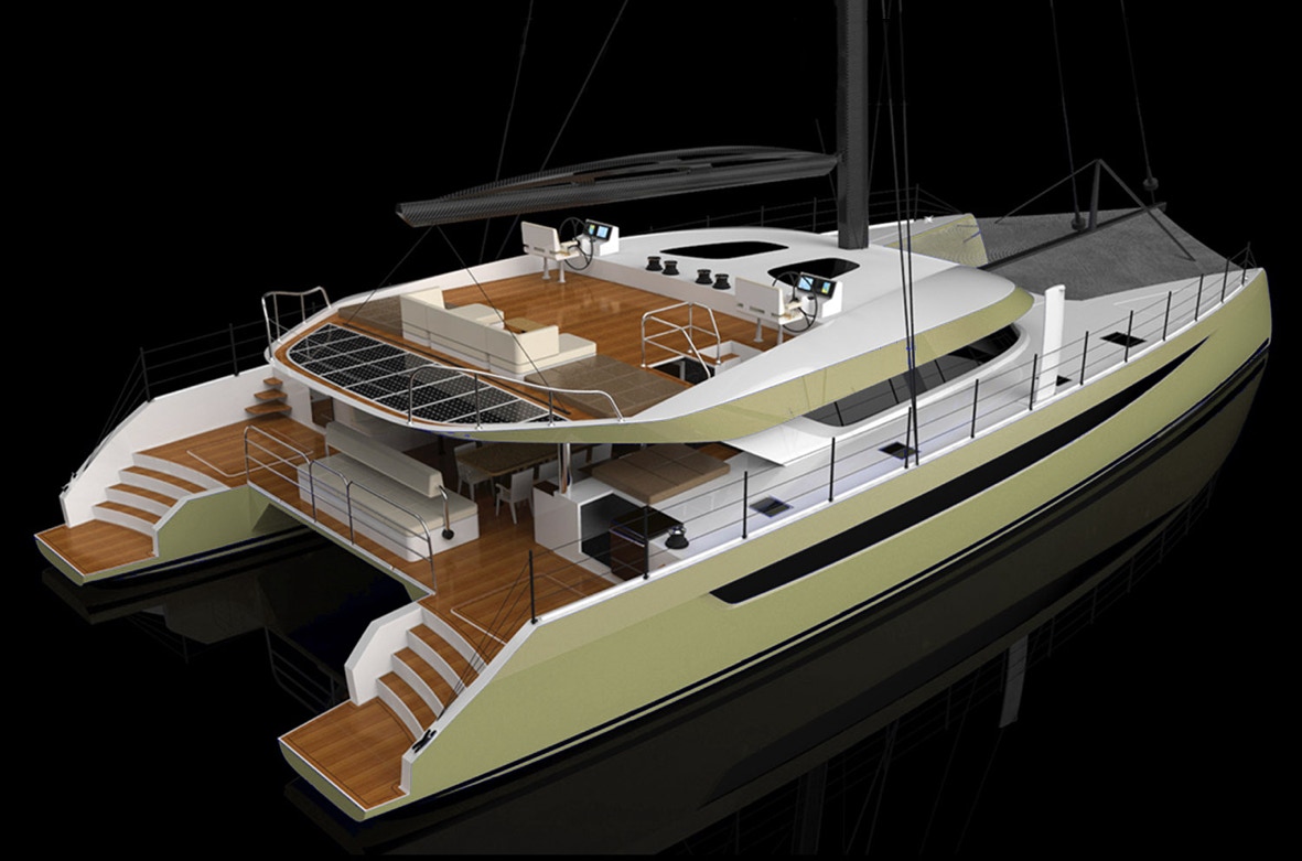 With the HH 77 we now see a size that lends itself to having a bridge. Available Open Concept as above or with a complete enclosure. Built of Carbon Fiber and designed by Morreli and Melvin the HH 77 is a performance luxury yacht with an interior rivaling super yachts. The magic here is that the HH 77 can travel speeds far exceeding most super yachts all the while not requiring engine propulsion. Perhaps I should have made the color of the model green.