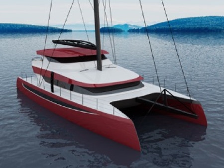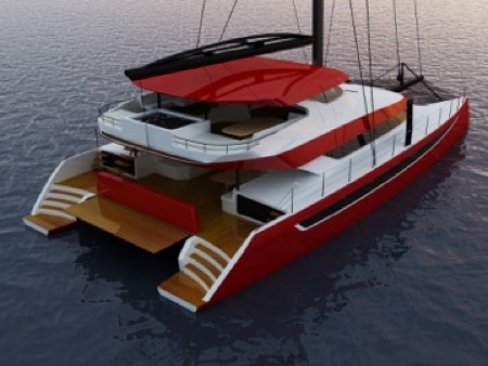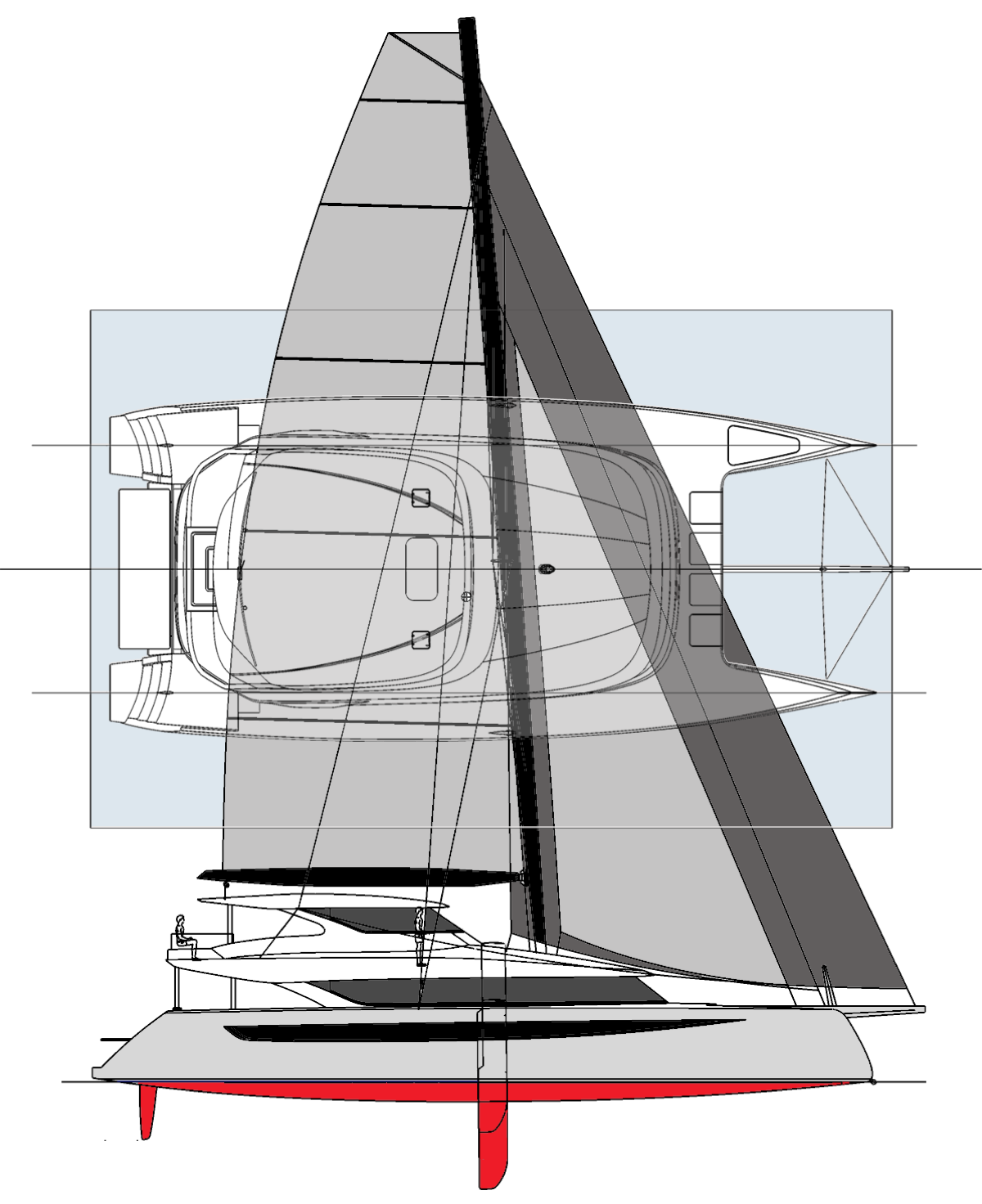 If you have sailed the HH 66 or been aboard an HH 55 you will recognize the design cues. They include a large bridge deck cabin with appropriate overhangs and shadow lines. The bright cabins are maintained with long windows on the hulls. This is a daggerboard boat of course. That means upwind performance because you know the typical wind direction is coming from where you want to go.